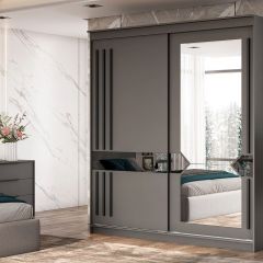 Внутреннее наполнение шкафа включает удобные полки и два выдвижных ящика с одной стороны, а также вместительную платяную секцию с надёжной металлической штангой для одежных вешалок за другой створкой. Нижнеопорная система раздвижных створок обеспечивает лёгкое и ровное открытие.